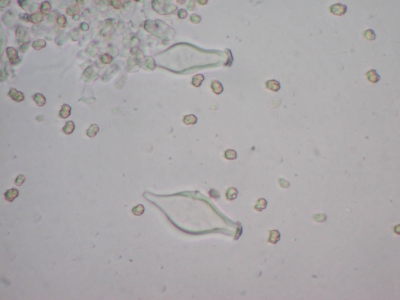 Pl.: metuloid 便腹型で中間部でやや太く膨らむ。頂部に結晶を付ける。