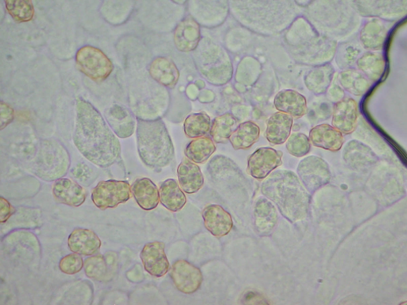 Spore: 8.4-9.7 x 5.8-7.3um, 高さの低いこぶ。