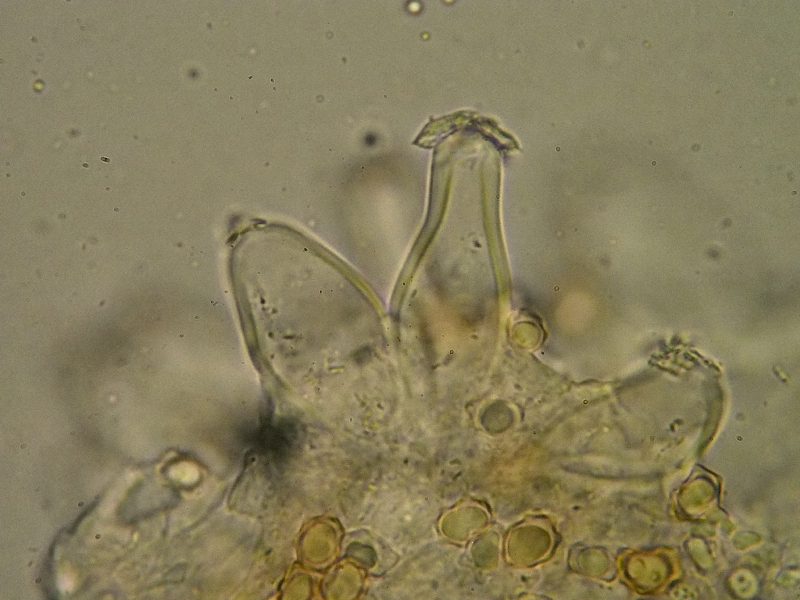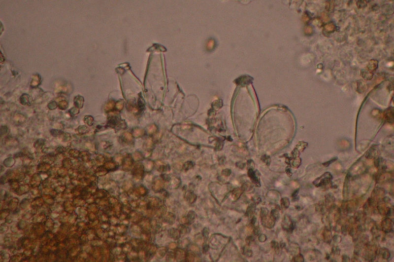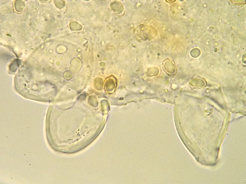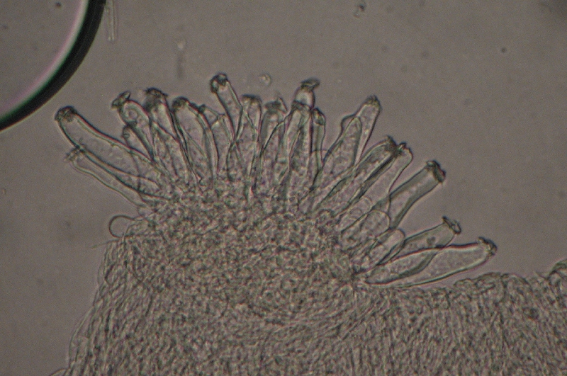 縁シスチジア: メチュロイドで厚膜、便腹形。薄膜棍棒状のパラシスチジアが混じる。