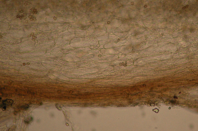柄シスチジア: 基部までメチュロイド。パラシスチジアと密生する。