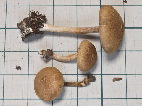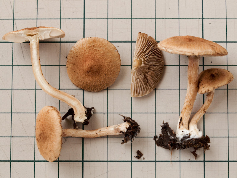 柄: 頂部のみやや白っぽく、粉状で、以下は褐色で、白色繊維が表面に付く。中実〜中空。