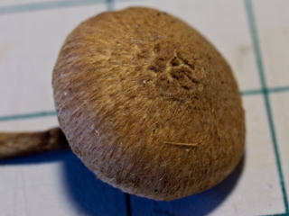 傘: 15-25mm, 全面が放射繊維状で、特に中央部から多少立ち上がるが、殆ど平滑の個体もある, 黄土褐色〜栗褐色