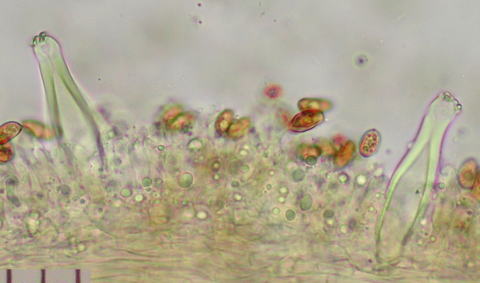 (縁シスチジア): 34-60 x 11-20 um, Vm=10, 厚めの厚膜メチュロイドで、紡錘形が多いが。希に太鼓腹形なども混じる。それを多量の棍棒形、卵形、円形の薄膜パラシスチジアが取り囲む。