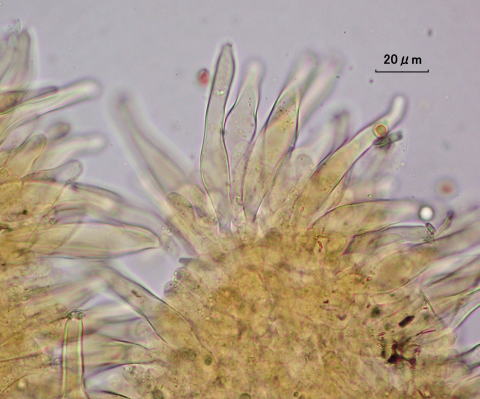 Caulocystidia(柄シスチジア): ごく頂部のみに紡錘形のメチュロイドと、薄膜棍棒形~円筒形のパラシスチジア見られる。