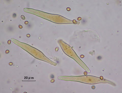 Spores(胞子): 平滑で、広楕円形~類球形, 6.3-7.9 x 4.7-5.8 um, Q=1.1-1.5。タマアセタケは、その名の通りほとんど球形の胞子を持つ。