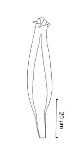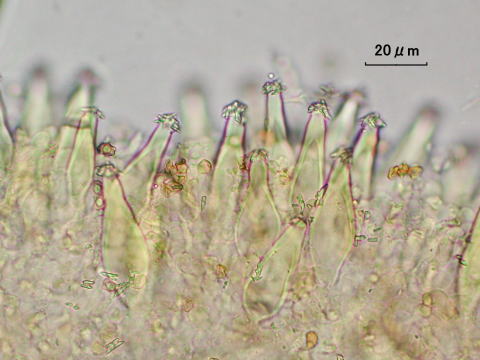 Pleurocystidia(側シスチジア):多数,先が細まった円筒形をなし,無色で著しく厚膜,頂端は丸みを帯びるとともに結晶あり。 (40-69×11-17μm※1)。