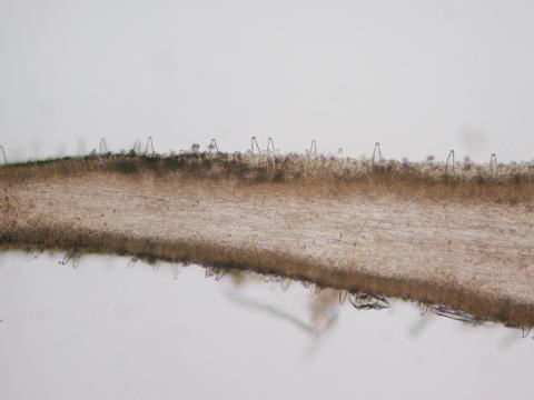 Cheilocyctidia(縁シスチジア): 側シスチジアと同様にかなり厚膜で、非常に多い。(37−57 x 12−14um ※1)