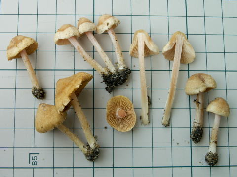 和名の通り、柄のピンク色が綺麗なアセタケ・・・でも臭い。柄表面は、全面粉状(=柄シスチジアが基部まである)で、縦のスジが入り、傘は最初平滑だが、のち周辺がささくれてくる。検鏡しても、シスチジアがとても厚膜であることや、胞子が多角形に近いコブ状であることなど、特徴が比較的はっきりしている。
