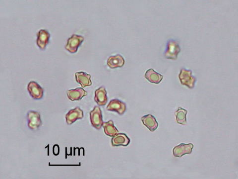 Spores(胞子):ごつごつと小さなコブのある多角形 (6.3-9.3 x 4.2-6.7μm ※1)