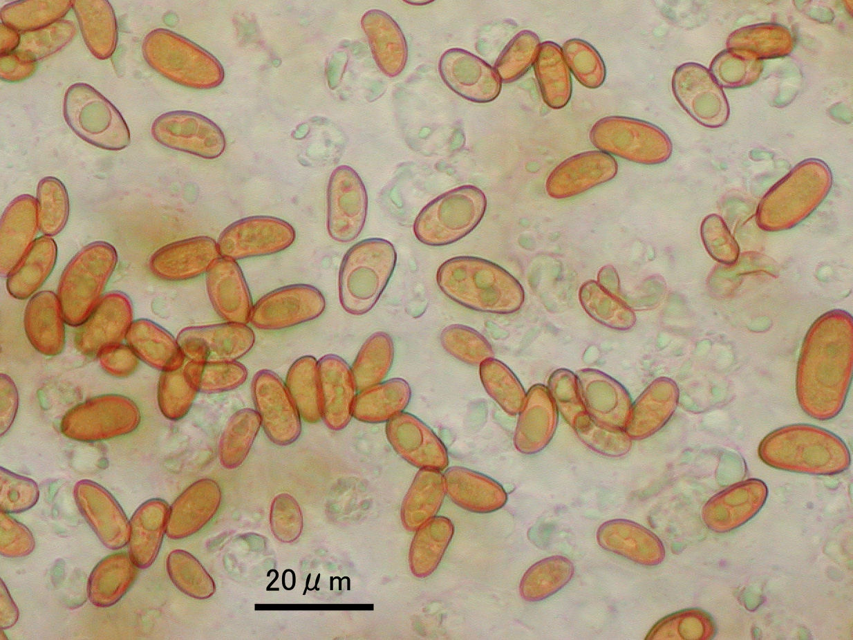 Spores (胞子): 楕円形、近縁種に比べて顕著に大きい。(-10)12-15.5(-18.5) x 6-9.3, Q=1.64-2.26; Vm=50