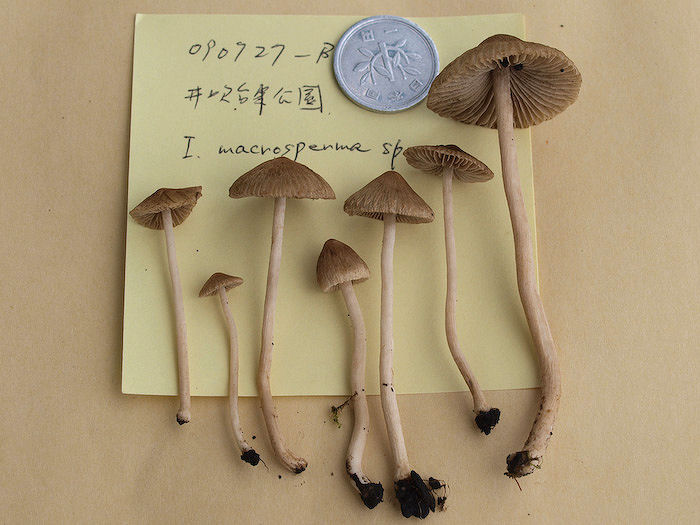 x 10um ほどにもなることが名前の由来にもなった大きな特徴。神戸市内各所の公園などでも発生を確認しており、市内ではもっとも普通に見られるアセタケの一つ。