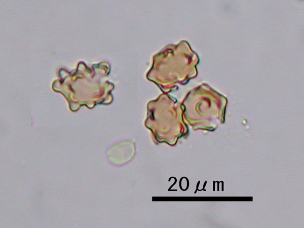 胞子:8.8-11(-12) x 7-8.5um, Q=1.1-1.4, やや低めで多数のコブで覆われる。コブの高さは1-1.5um, コブの数は外周で5-8個、内面に2−4個ほどが見える。