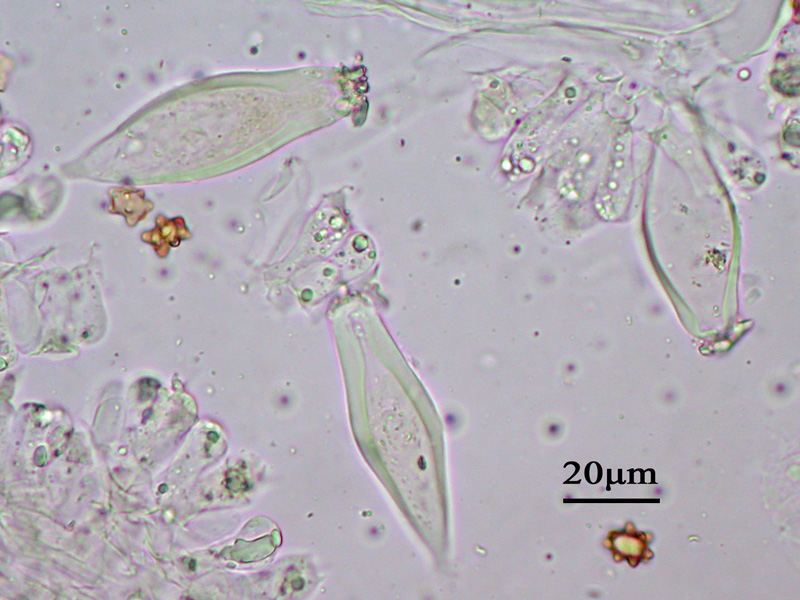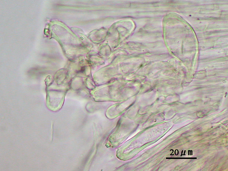 縁シスチジア: 厚膜(2-3.5um)のメチュロイドタイプで頭部に結晶を付け、39-52(-60) x 15-19(-21) um, 紡錘形、広紡錘形、太鼓腹型。