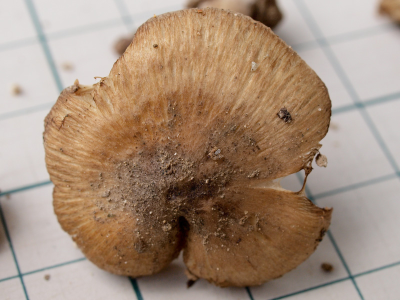 傘:径23-36mm, 中高−平らに開く,表面平滑, 放射繊維状, 縁部長く割裂し、溝線状、黄土褐色〜暗黄土褐色、中央やや濃色。