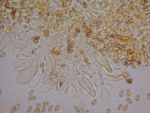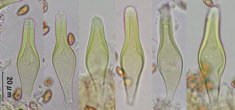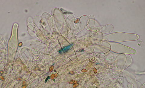 ごく頂部のみ、紡錘形のメチュロイドと、薄膜で棍棒、円筒形のパラシスチジア多数が混じる。
