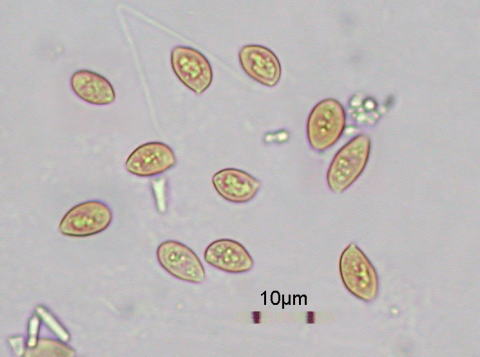 Spores(胞子): 平滑で、楕円形~アーモンド形 8.5-11.5 x 5.3-6.3um,