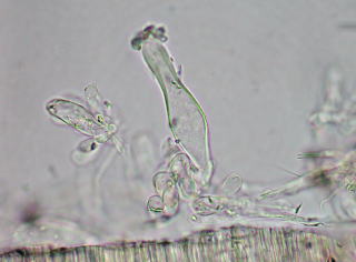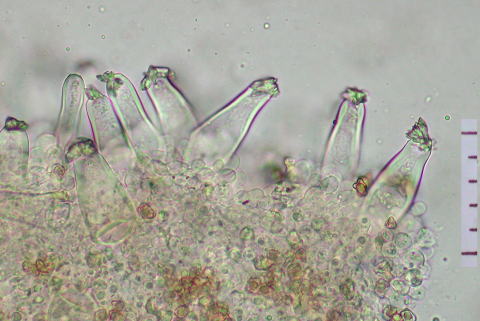 Caulocystidia(柄シスチジア): メチュロイドのシスチジアとパラシスチジアが混在する。