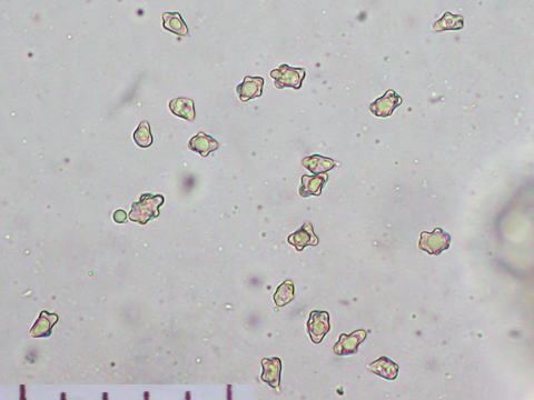 Spores(胞子): 角形でこぶ状突起。形の変異は大きい。7.1-9.5x5.0-6.2um (Q=1.2-1.6)